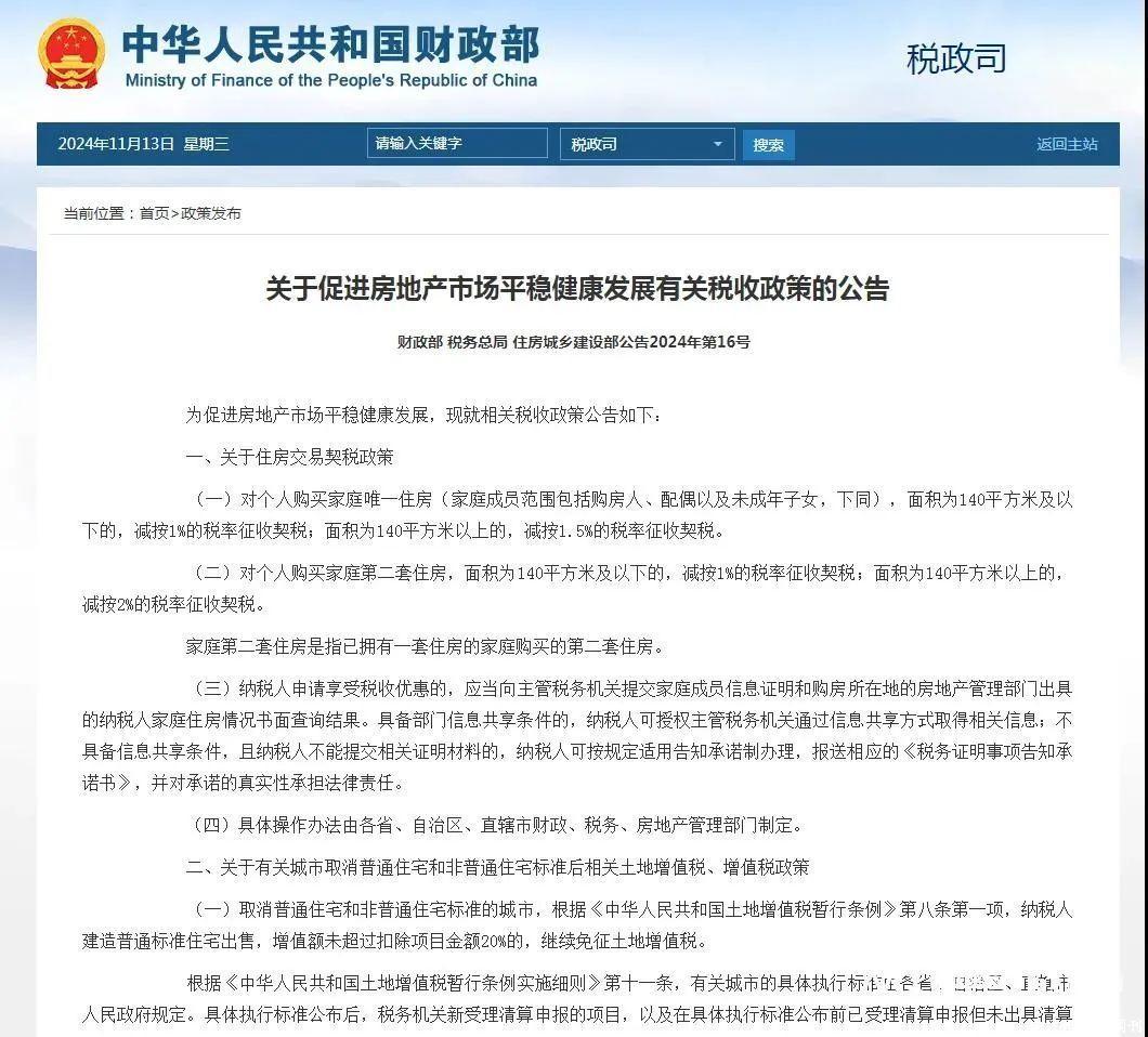 在此前的11月13日,财政部、税务总局、住房城乡缔造部发布《对于促进房地产市集牢固健康发展干系税收计策的公告》,提议在寰球限制内,首套住房,面积为140平常米及以下的,减按1%的税率征收契税;面积为140平常米以上的,减按1.5%的税率征收契税。二套住房,面积为140平常米及以下的,减按1%的税率征收契税;面积为140平常米以上的,减按2%的税率征收契税。