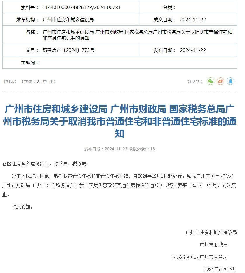 广州市住房和城乡缔造局、广州市财政局、国度税务总局广州市税务局当天蚁集发布《对于取消我市平凡住宅和非平凡住宅圭臬的奉告》,明确取消广州市平凡住宅和非平凡住宅圭臬,自2024年12月1日起执行。原《广州市国土房管局 广州市财政局 广州市所在税务局对于我市享受优惠计策平凡住房圭臬的奉告》(穗国房字〔2005〕375号)同期废止。